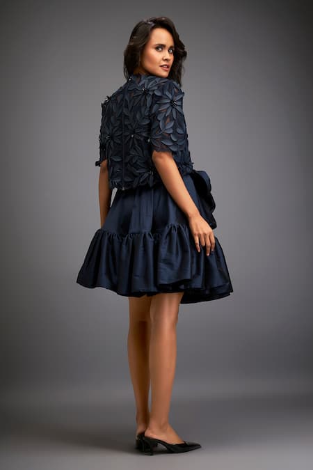 Navy blue top with floral applique detailing. Paired with a tiered ruffled skirt.