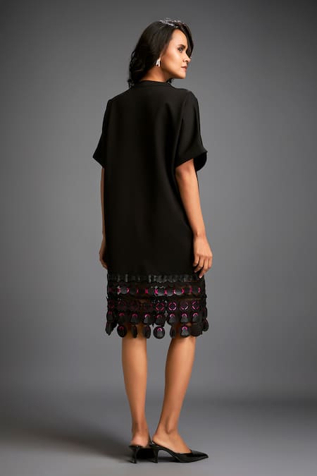 Black midi dress featuring a round neckline and half sleeves. The dress is adorned with pink geometric cutwork applique at the hem and comes with a matching belt.