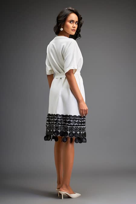 Contrasting black geometric leather applique, Hanging detailing on the hem, Belted waist design