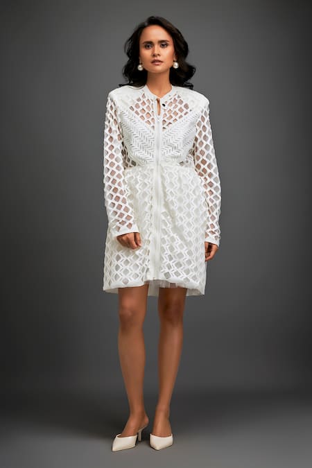 White semi sheer geometric cutwork dress featuring a front zipper and silver lining