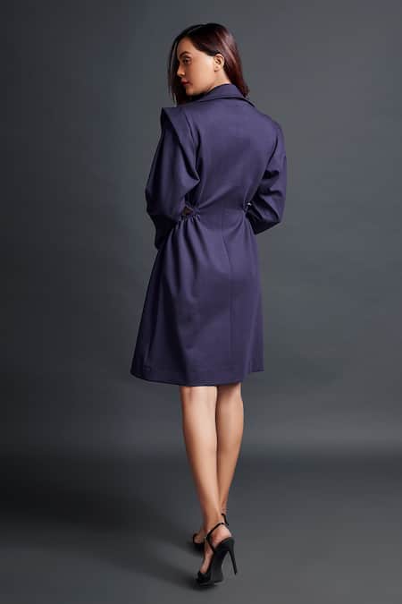 Purple jacket dress featuring a lapel collar and full sleeves. Comes with a floral applique belt and side cut-out detailing.