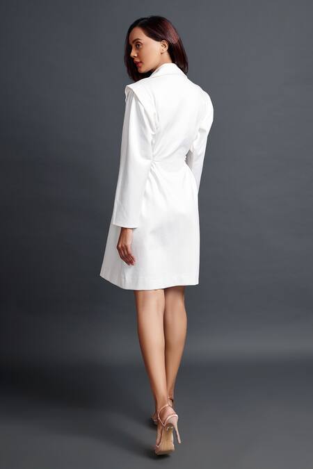 White jacket dress featuring a lapel collar and full sleeves. Includes a floral applique belt and side cut-out detailing.