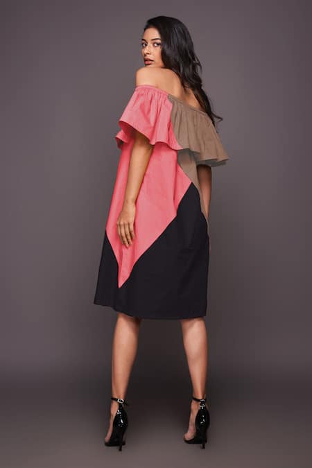 Black and pink colorblocked off-shoulder dress crafted in 100% cotton
