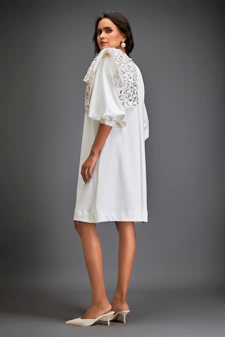 Placed shoulder bow detail, 3D work with metallic disks, Puff sleeve design