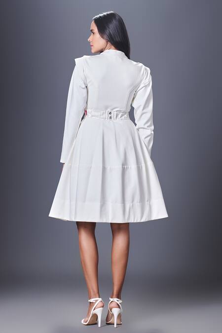 White dress featuring a mandarin collar, full sleeves, and a front button closure. Comes with an embroidered belt for added style.