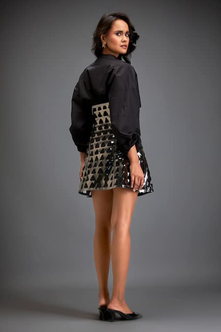 Black shirt featuring a mandarin collar and balloon sleeves. Paired with a high-waisted skirt adorned with triangular cutwork details.