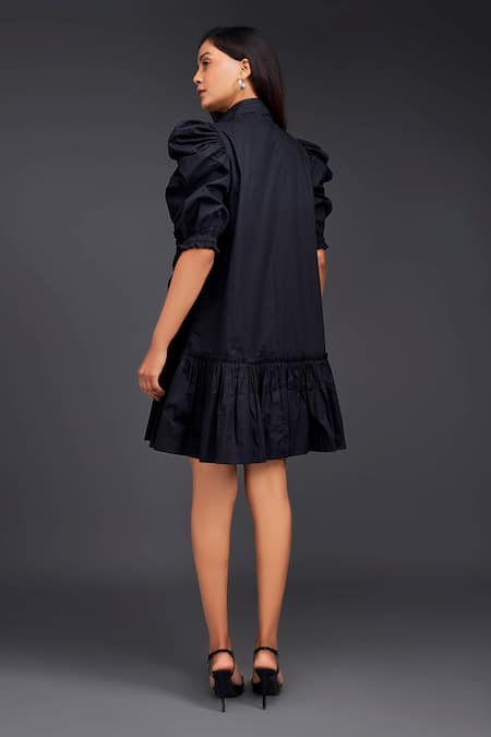Black dress featuring a high neck, front buttons, and puff sleeves