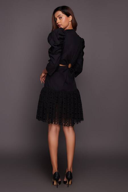 Black dress featuring a V neck and puffed sleeves with a cutout waistline