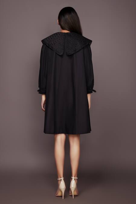 Black A-line cotton dress with round neckline. Paired with detachable chelsea floral applique cutwork collar.