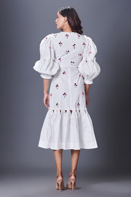 White midi dress featuring a V-neckline and puff sleeves