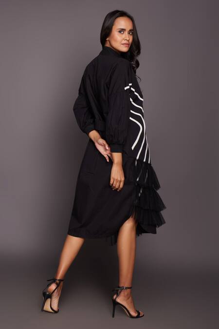 Black Cotton, Net Striped Collared Neck Ruffle Shirt Dress