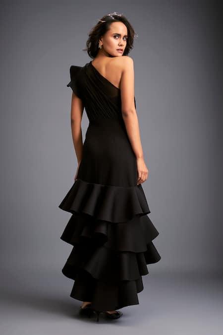 Floral Swarovski embroidery on one shoulder, Ruffled skirt with layered design