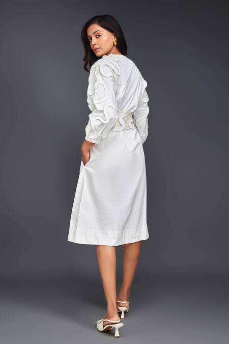 White Cotton Round Neck Tonal Pleated Frill Dress And Belt Set