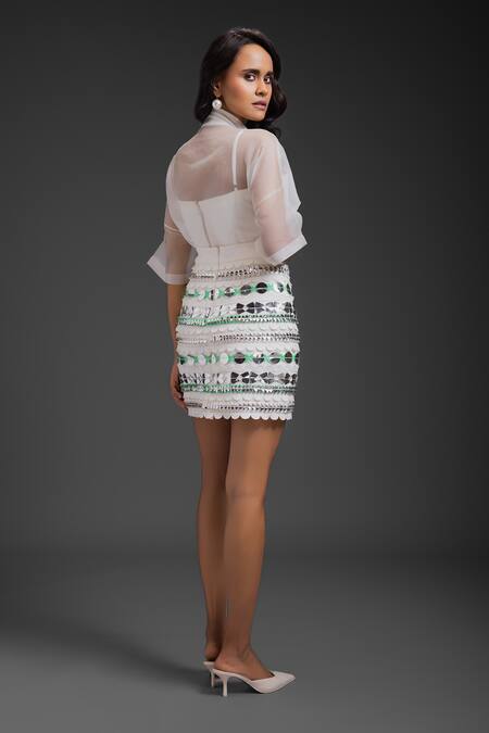 White skirt featuring intricate embellishments and scalloped hemline