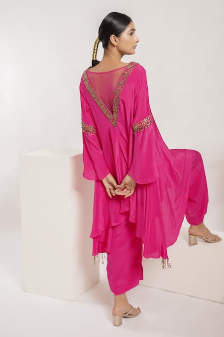 Raani pink asymmetric hem kurta featuring sequin, salli, bead & tassel hand embroidered neckline and sleeves. Paired with a solid pleated palazzo pant.