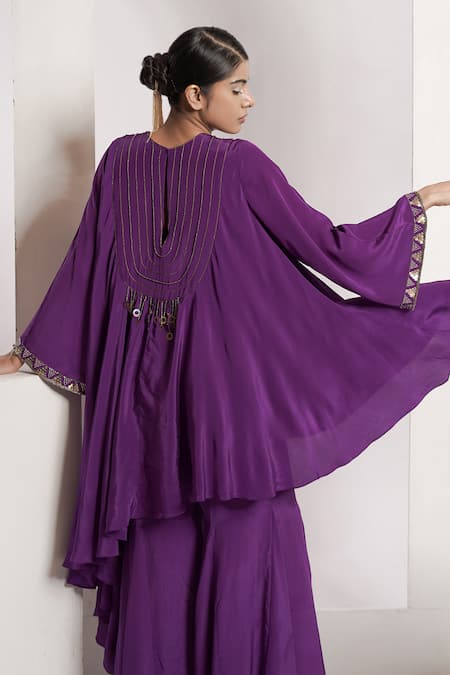 Purple kurta featuring hand embroidery with sequin, salli, and tikki stone embellishments. Paired with coordinating solid panelled flared pant.