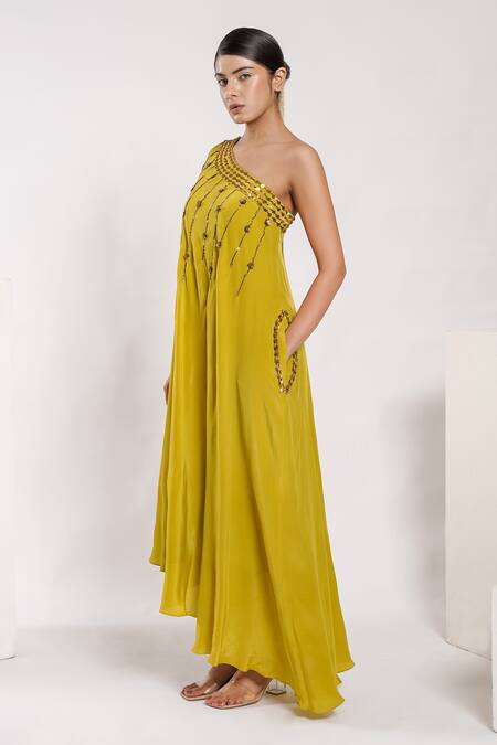 Yellow Crepe Embroidery, Sequins, Beads One Anti-fit Hand Flowy Midi Dress