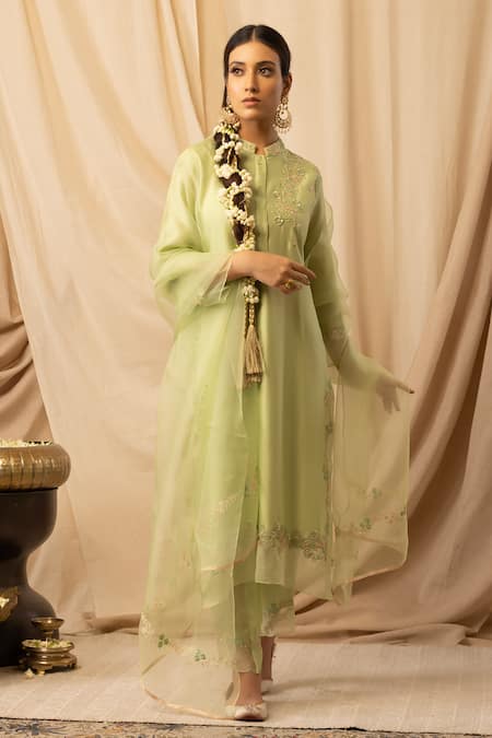 Buy_Deepika Chopra_Green Chanderi Silk, Organza, Bamboo Avacado Straight-cut Kurta Salwar Set_Online_at_Aza_Fashions