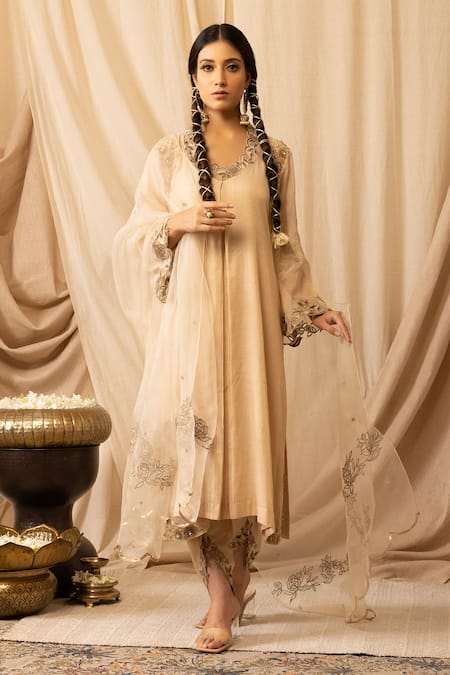 Gold Chanderi, Satin, Organza Embroidery Round Desert Rose Kurta Salwar Set