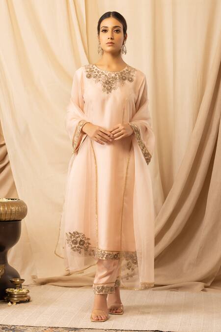 Buy_Deepika Chopra_Peach Organza, Satin, Bamboo Zari, Embroidery Hand A-line Kurta Salwar Set_Online_at_Aza_Fashions
