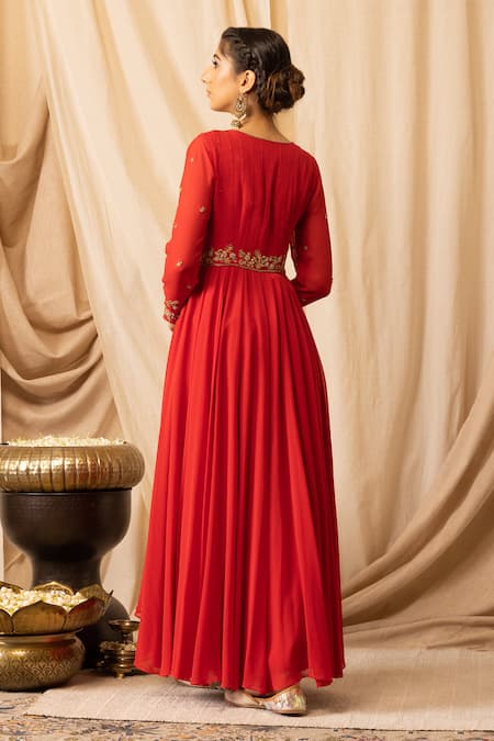Signal red pure georgette padded anarkali featuring zardosi, French knots, and resham hand embroidery. Paired with a tissue palazzo and a pure organza silk dupatta.