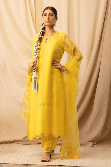 Yellow straight kurta in pure organza silk featuring zardosi, french knots, and resham hand embroidery. Paired with bamberg satin salwar and a matching dupatta.