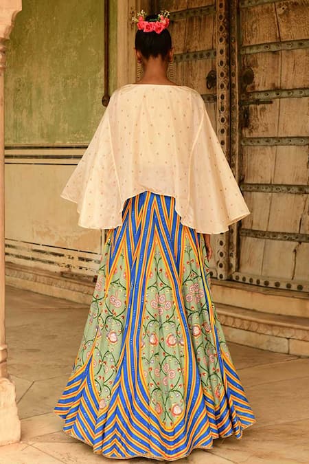 Blue silk lehenga featuring multi-colored hand embroidery and floral prints. Paired with an off-white cape adorned with motifs work.