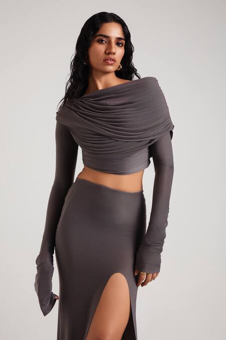 Purple Net, Lycra Asymmetric Aylin Drape Top With Skirt
