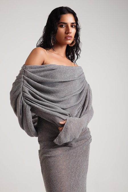 Grey stone gown featuring an off-shoulder design with draped pleats and an asymmetric pattern
