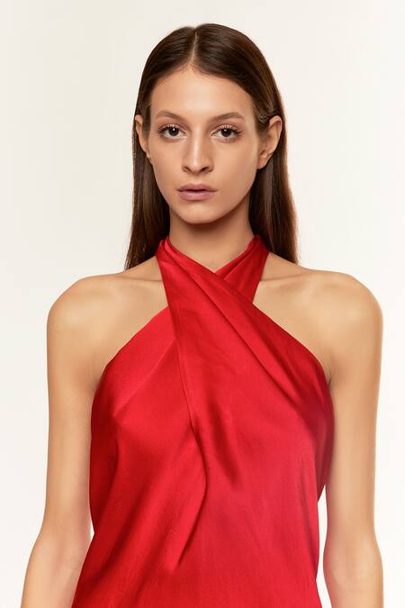 Red satin dress featuring a criss-cross halter neck and cowl hem
