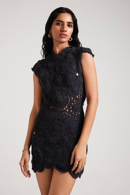 Black Cotton Embroidery Collared Caitlin Crochet Dress