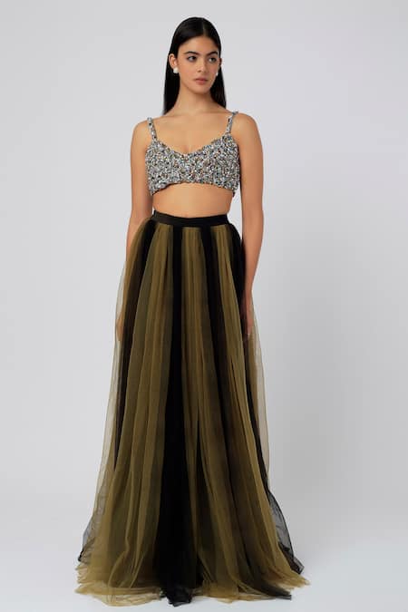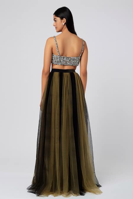 Olive green, black striped shaded skirt in a tulle base. Comes with crystal embellished blouse.