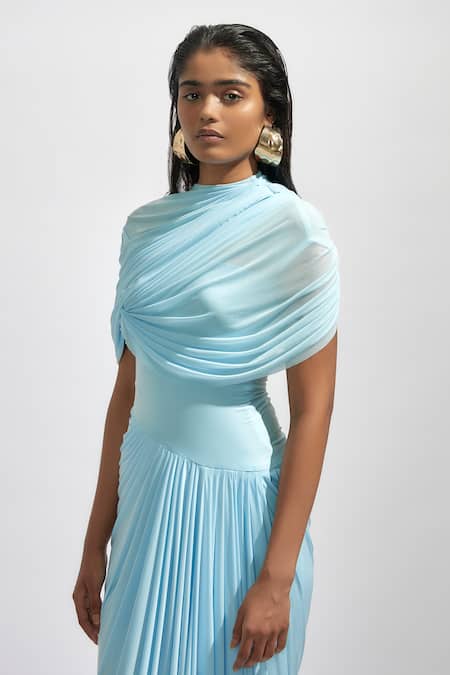 Blue Net High Neck Draped And Pleated Maxi Dress