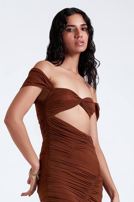 Burnt brown gown featuring ruched detailing in the front with gathers, waist cut-out & front slit