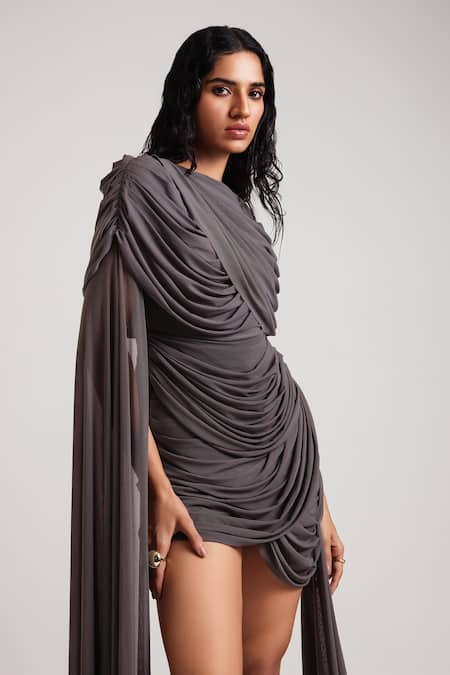 Draped panels creating a flowing silhouette, Long trail sleeves for added drama