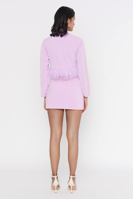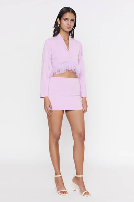 Lilac cropped jacket with feather hem. Paired with mini skirt.