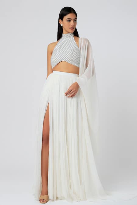 White Shimmer Chiffon Halter Front Slit Lehenga Set