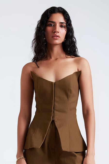 Military olive structured top crafted from denim drill featuring a strapless design and front hook & eye closure. Paired with draped pants for a stylish look.