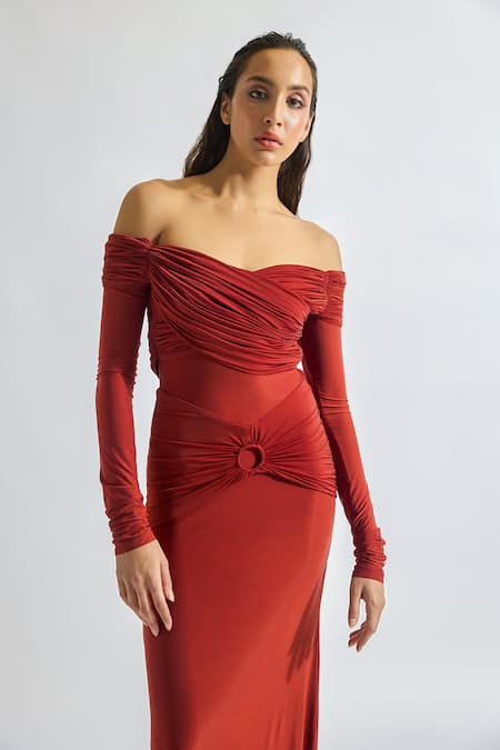 Brick red off-shoulder draped dress made from malai lycra featuring ring detailing