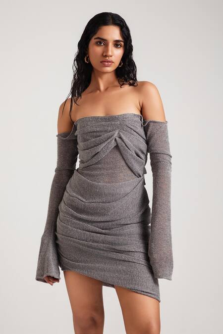 Grey off shoulder dress featuring a pleated and cowl draped bodice