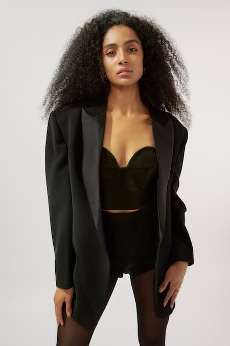 Black solid blazer featuring a lapel collar and front pockets. Paired with a sweetheart neckline bralette, high-waisted shorts, and mesh stockings.