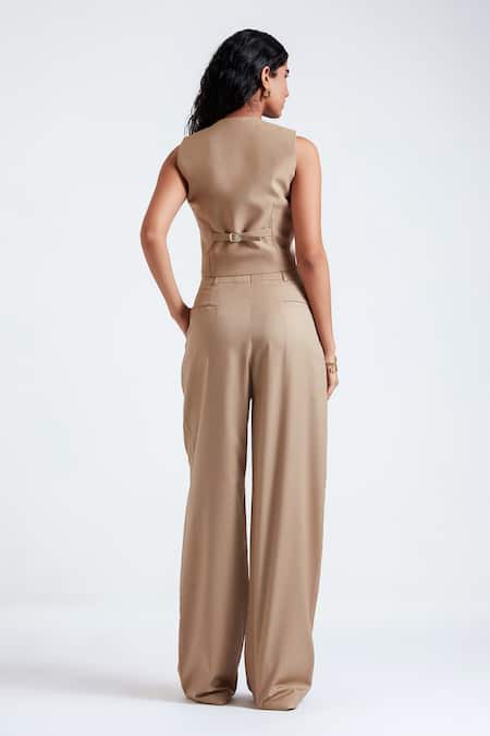 Beige solid blazer featuring notched lapel collar and front pockets. Paired with a coordinating waistcoat and pant in a relaxed fit.