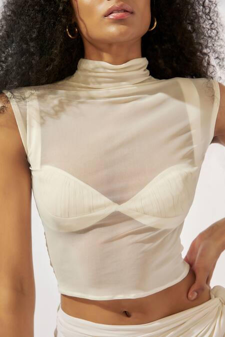 Ivory mesh high neck top featuring sleeveless bralette design. Paired with a draped skirt made from modal satin and malai lycra.