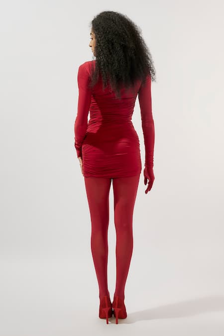 Maroon Net, Maheshwari High Neck Ruched Short Dress With Stockings