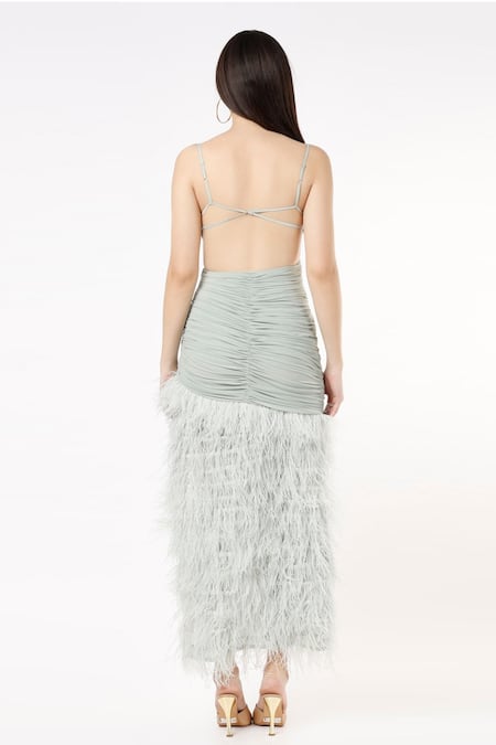 Mint ruched dress with front cut-out & feather embellished hem with side slit.