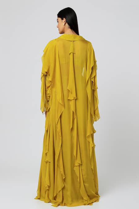 Mustard olive long cape with ruffle trims. Comes with stone embellished blouse and co-ordinating lehenga.