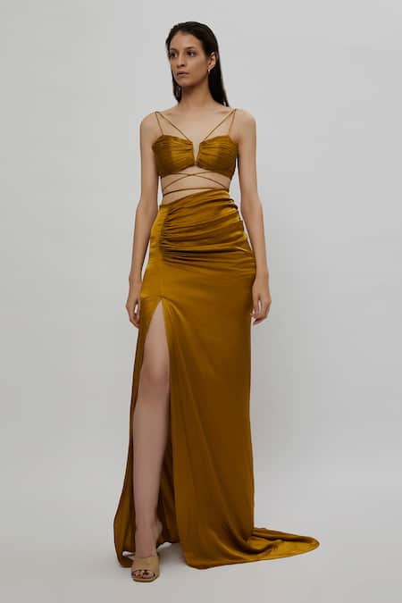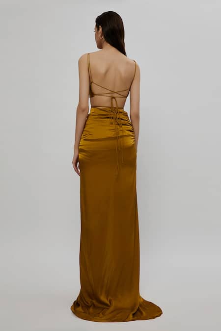 Mustard satin crop top with ruching, dual shoulder straps and tie up at the waist. Comes with co-ordinating maxi skirt.