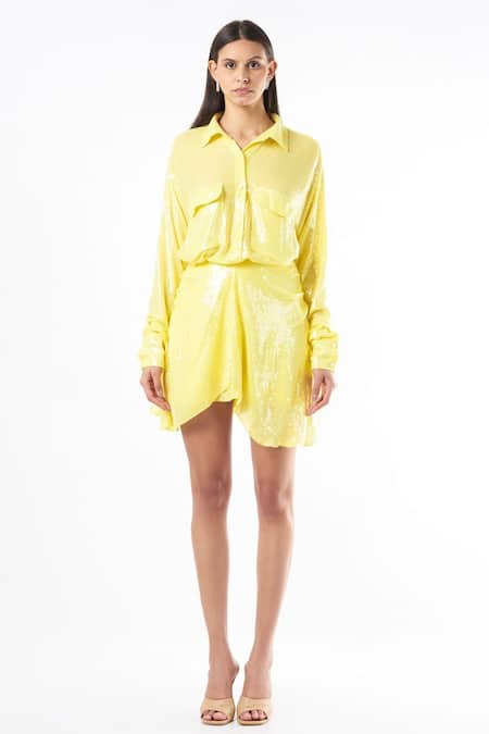 Yellow Crepe Sequins Collared Neck Shirt And Skirt Set