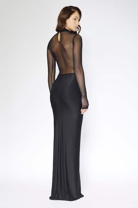 Black sheer panel maxi dress featuring a fitted silhouette and high neck