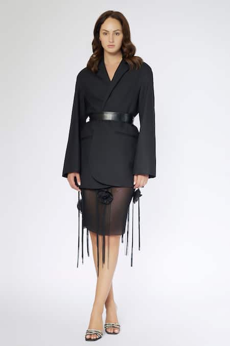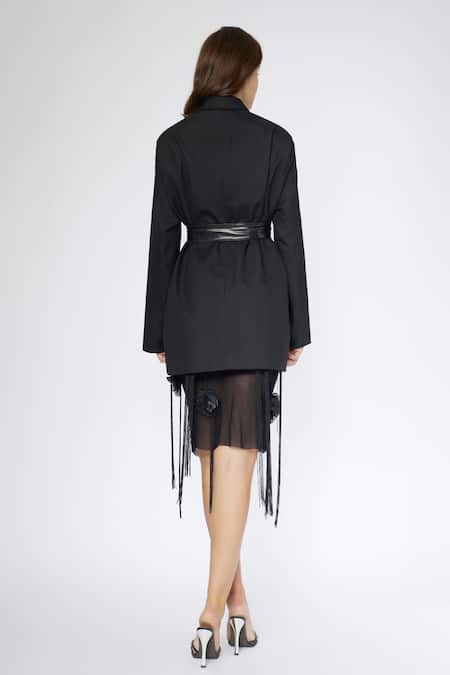 Black blazer featuring a lapel collar and welt pockets. Paired with a sheer panel applique skirt adorned with floral details and fringes.